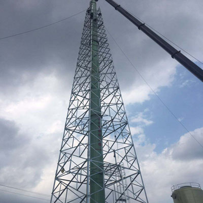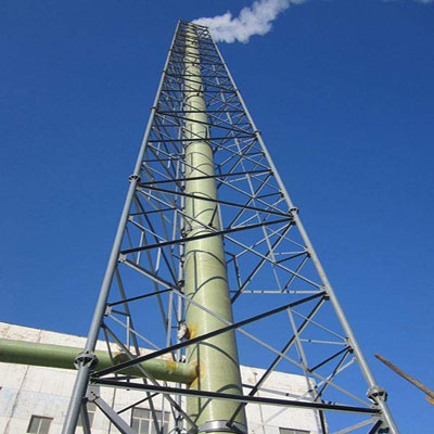 烟囱塔塔架属于高耸钢结构,不定型产品,对工程情况的不同可以根据其要求由设计人员设计塔架架构。塔架的用途很广泛,主要用于工厂风管、烟囱的支撑、大型建筑物支撑、起重塔吊、水塔塔架、监控工程、通信工程等其它特殊用途。 塔架主要结构及材料:角钢、槽钢、钢管、H型钢、圆钢塔架主要连接方式:法兰盘连接、连接板盘,烟囱塔塔架表面防腐前,要对表面进行喷砂除锈,除锈合格后,再按要求进行防腐处理。排气筒外部防腐同塔架。内部喷砂合格后作衬胶防腐。