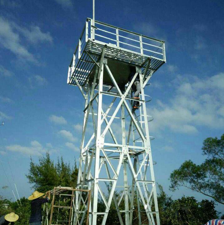 瞭望塔作用:瞭望塔用于交通或群众活动场所的值勤;监狱牢房的民兵;边防哨卡的执勤防卫;林业部门森林防火,宣传布置防火任务,组织安排防火工作,有效护理大自然,在紧急情况下,用于指挥消防控制火势的登高望远的灵活工具。 安装方便平面为四边形自立式或拉线式。主体曲线一般为折线型,内部结构为交叉式。上部设工作平台或值勤房。内部设有斜向爬梯或旋转爬梯。