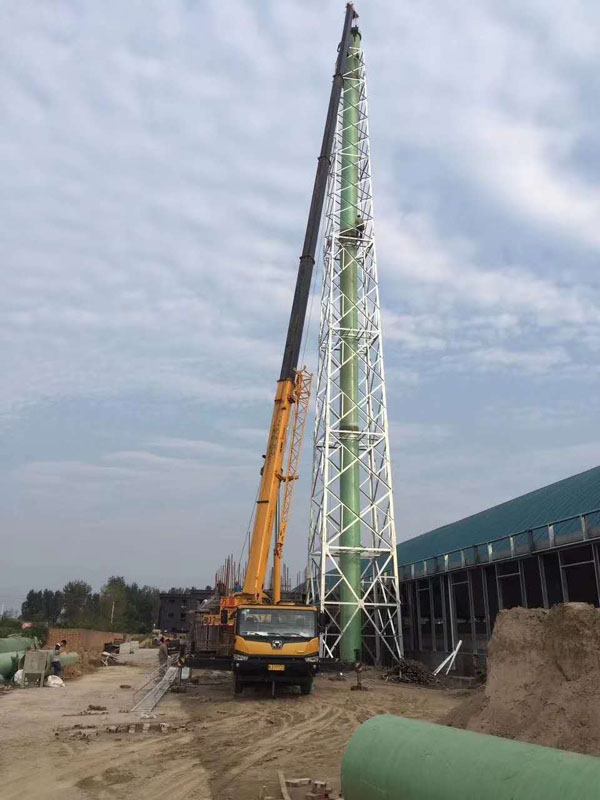 塔架式结构烟囱采用钢为材质制造,成品具有造价低,制作周期短,使命长,加工方便,安装 简单,质量轻,强度,刚度高,采用玻璃钢制造内外表面光滑,抗老化性能、在高温下内腐蚀 性能优良等特点,而且可以方便的增加喷淋器、过滤网等以吸收烟气中的有害成分。我们已经 摸索出一套成熟的、可靠的生产和安装工艺以确保烟囱的安装精度。玻璃钢烟囱现广泛应用在 电力、化肥、化工、冶炼、石油等行业,作为腐蚀性或高温烟气的处理设备。